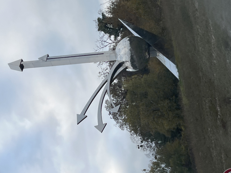 This image depicts a large, reflective metal sculpture, known as the "Signal du Futuroscope" or "Flèche de l'Avenir," situated on a grassy embankment under an overcast sky. The sculpture, located at the intersection of the A13 and A154 motorways near Tourville-la-Rivière, France (specifically near the D921 exit), is the dominant subject. The sculpture is composed of polished, silvery metal. It features a tall, slender vertical shaft that tapers to an arrow-shaped finial at its apex. A smaller, secondary arrow-like element projects from the main shaft just below the top. Approximately halfway down, a large, faceted, highly reflective spherical element is integrated. From this sphere, three curved arms extend diagonally leftward and upward, each terminating in a distinct arrowhead. The entire structure is anchored by two prominent, sharp, wedge-shaped base elements that rise from the ground. The foreground consists of a sloping bank covered with dry, brownish grass and sparse vegetation. A partial red circular road sign is visible at the bottom left. In the background, a dense line of trees and deciduous foliage, exhibiting autumnal characteristics with both green and bare branches, rises behind the sculpture. Clusters of mistletoe are visible on some bare branches to the left. The sky is uniformly overcast with diffuse, light grey cloud cover. No individuals or active subjects are present in the scene.