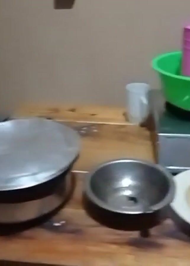 The scene presents a kitchen area with a gas stove placed on a wooden table. On top of the stove, there's a green bowl containing a pink bucket, and beside it, a white bowl filled with a white substance. To the left of the stove, a covered cooking pot sits on the table, next to a small stainless steel bowl. In front of the stove, there are two plates with spoons on them, appearing to have remnants of food. An orange container also sits on the right side of the plates. In the background, there are additional plastic containers and other kitchen items. A person wearing a blue and grey striped shirt is briefly visible on the right side of the frame.