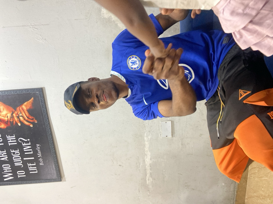 The image depicts an indoor setting within the city of Yenegoa, Nigeria. The precise location within Yenegoa is not discernible from the visual information provided. An adult male with dark skin is seated, positioned slightly right of center. He wears a blue Chelsea Football Club jersey, black athletic trousers with prominent orange segments, and a black baseball cap featuring a gold-colored 'LV' logo. His expression is a slight smile, with his tongue subtly visible. He is engaged in a handclasp with a child, whose left arm and partial torso are visible on the right side of the frame. The child wears a light-colored top and a light pink ruffled skirt. The man is seated on a dark blue upholstered surface. The background wall is light grey, exhibiting signs of wear and discoloration, with a white electrical outlet box mounted on it to the man's left. A framed picture hangs on the wall in the upper left, displaying an image of Bob Marley and the text 'WHO ARE YOU TO JUDGE THE LIFE I LIVE?' and 'Bob Marley'.