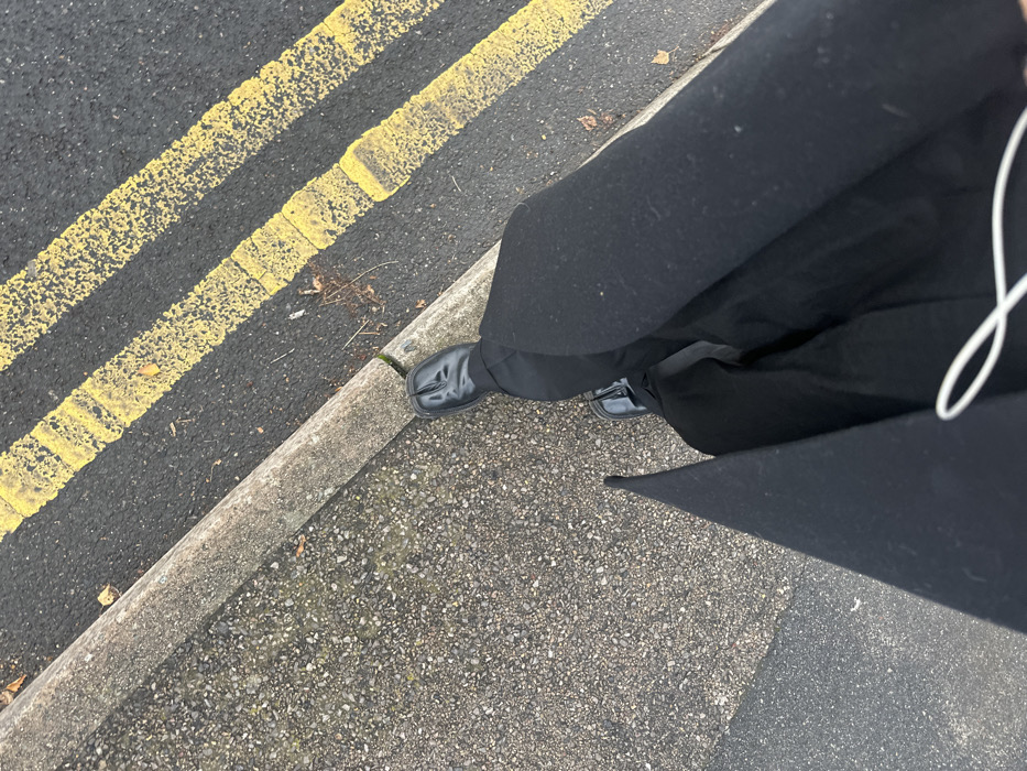 A high-angle photograph depicts the lower body of an individual positioned at the edge of a kerb, characteristic of a street scene consistent with urban areas within Tonbridge and Malling, United Kingdom