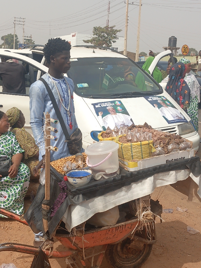 The image depicts an outdoor scene in Ube, Nigeria, under bright daylight on reddish-brown, dusty ground. In the foreground, a young Black male stands in profile facing right, wearing a light blue long-sleeved tunic with white embroidery, a long white beaded necklace with red tassels, and a dark patterned sling bag. He stands next to an orange, two-wheeled pushcart with a sales counter. The cart displays various items: a clear plastic bucket with a pink handle, a white bowl with blue stars, numerous brown, lumpy items (likely snacks) in baskets and a cardboard box labeled "Butagate," and another section containing light brown, round items (likely peanuts). A wooden stick with several small, rolled items attached is affixed to the cart. Behind the vendor and cart, a white minivan or passenger van is parked with its front and rear left doors open. The vehicle's hood features two large identical political posters showing an older male politician in a white traditional outfit, identified as "MR. CAPACITY" with a political party logo. Inside and around the vehicle, several individuals are visible, including a dark-skinned man in a black shirt in the driver's seat, a Black woman in green attire near the driver's door, and another Black woman in a black and red patterned hijab to the right. A Black woman in a green and white patterned dress is partially visible seated on the far left. The background features overhead power lines, a utility pole, and a yellow circular speed limit sign displaying "30" on a pole to the right, against a hazy sky.