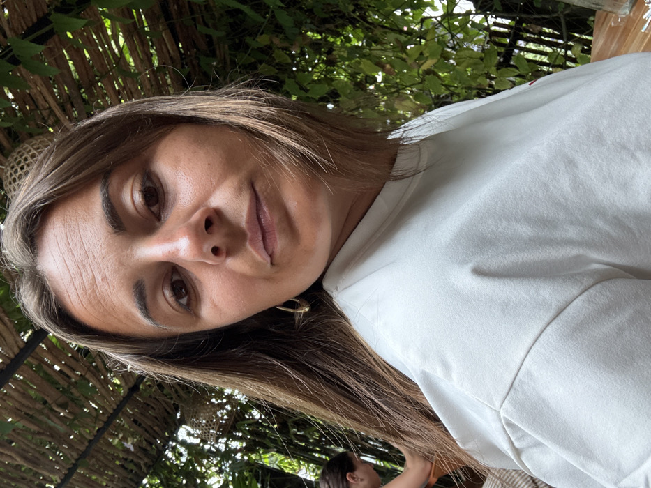 A woman with long brown hair and brown eyes is angled, looking toward the camera. She is wearing a white shirt. Behind her are green leaves and what appears to be a woven structure. Another person's head is visible in the lower part of the frame. The background appears to be outdoors, possibly in a garden or natural setting.