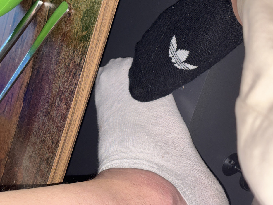 The image depicts an indoor scene in Nesebar, Bulgaria, viewed from a low perspective. In the foreground, a beige, soft-textured object, possibly fabric or a limb, is partially visible at the bottom. The midground features two feet. The left foot, attached to a pale, visibly hairy ankle, is covered by a light grey sock. The right foot, positioned slightly to the right and forward, is covered by a black sock adorned with a white Adidas Trefoil logo. Both feet are resting on a dark, flat surface. Above the feet, a wooden tabletop with a distinct grain pattern and a lighter perimeter trim is visible. On this tabletop, two silver-colored utensils, resembling forks or knives, are placed next to a segment of a bright green object, likely a bowl or cup. The environment appears to be a casual setting, possibly a dining area, with artificial lighting reflecting off the metallic utensils.