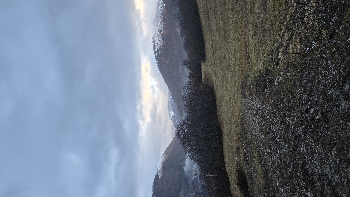 A landscape scene with a cloudy sky, mountains, a field, and trees. The mountains are on the left, with snow-covered peaks and dark forests at the base. The field is on the right, appearing dry or covered with sparse vegetation. Some trees line the edge of the field near the mountains. The sky is overcast, with varying shades of gray and hints of sunlight trying to break through. The image appears slightly rotated.