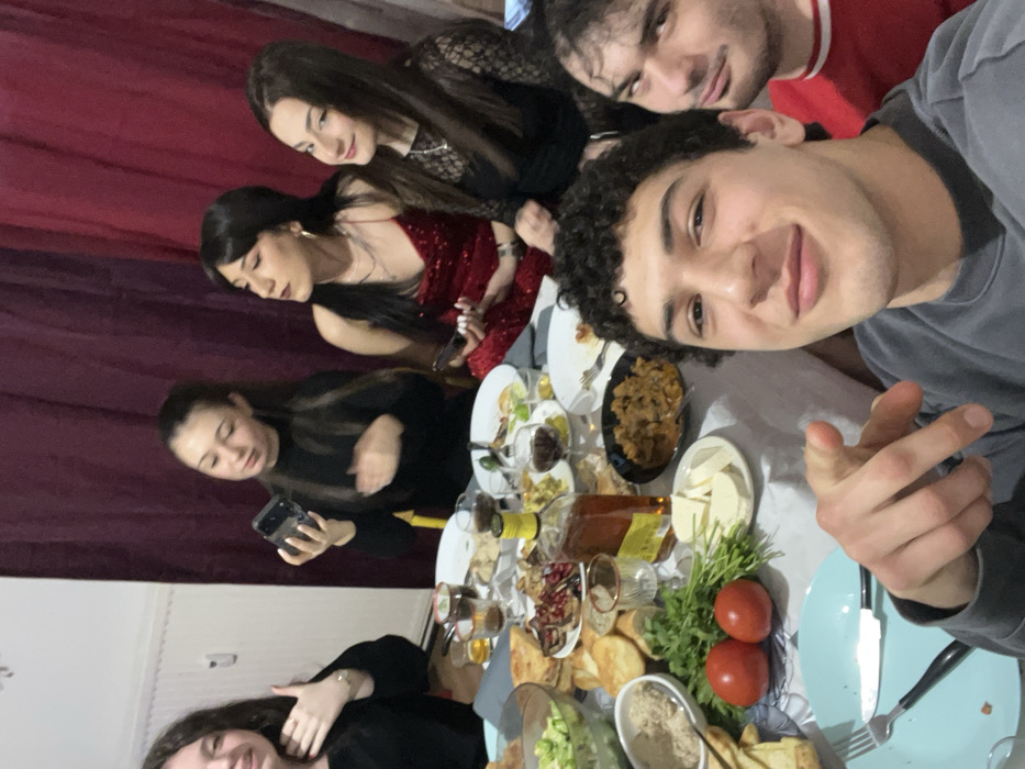 - "The image displays an indoor social gathering of six individuals around a table laden with food and drinks" by FM-uZazy2, licensed under CC BY 4.0
