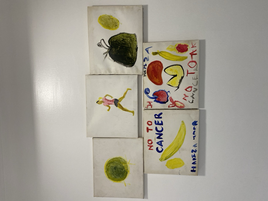 Five square-shaped, roughly uniformly sized paintings are displayed on a plain white wall. The wall exhibits a subtle specular highlight from an overhead light source. The paintings are arranged in two rows: The top row consists of three paintings: 1. The leftmost painting depicts a circular, textured green object, possibly a fruit, against a white background. 2. The central painting features a stylized figure of a person, appearing to be running, dressed in a pink top and dark shorts, with blonde or light-colored hair, against a white background. 3. The rightmost painting shows a dark green, somewhat amorphous object, resembling a gourd or a large fruit, next to a smaller, oval-shaped yellow object, against a white background. The bottom row consists of two paintings: 1. The leftmost painting contains the phrase "NO TO CANCER" written in blue capital letters at the top. Below this, a yellow banana is depicted, with a smaller yellow oval object to its left. The name "HADIZA UMMA" is written in blue at the bottom. 2. The rightmost painting features a collection of colorful, abstract and representational shapes: a red heart-like figure, a red kidney-like shape, a blue-veined organ, a yellow fortune cookie-like shape, a yellow banana, and a red berry-like object. The text "NO CANCER TO OK" is visible in red at the bottom, and "HAMZA" is written in blue at the top right. The style of the paintings suggests amateur or child-like execution, with bold colors and simple forms. The overall theme appears to be related to health and well-being, specifically against cancer, referencing healthy foods and physical activity. No specific location within the city of Abuja, Nigeria, can be determined from the visual content of the image.