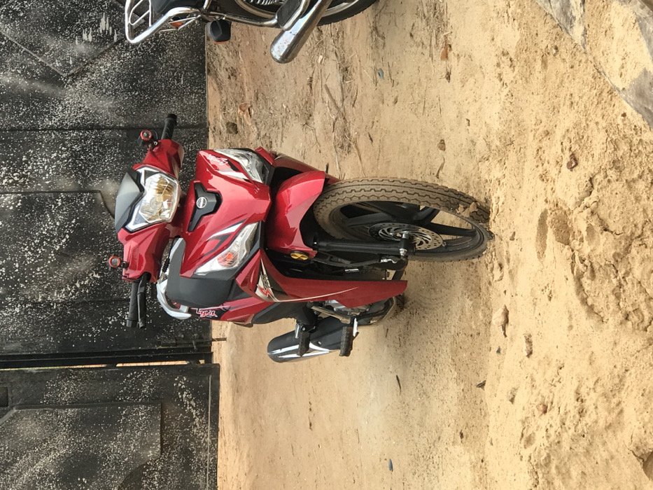 A red underbone-style motor scooter is parked on light brown, uneven sandy ground in the city of Unknown, Unknown