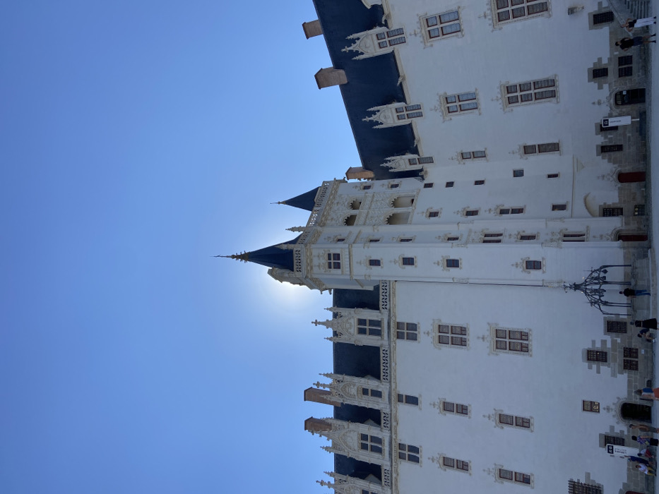 The image displays the inner courtyard of the Château des Ducs de Bretagne, located in Nantes, France. The central subject is the castle's white stone facade, featuring a prominent, multi-tiered central tower topped with a dark, pointed spire. The sun is positioned directly behind this spire, creating a strong backlighting effect against a clear, vibrant blue sky. The castle walls are uniformly white, contrasted by dark slate roofs that contain numerous ornate dormer windows with elaborate stone detailing and multiple brick chimneys. Rectangular windows with stone surrounds are consistently spaced across the facade. The lower sections of the castle walls transition to a darker, grey stone foundation. In the foreground and midground of the light-colored stone courtyard, an ornate, dark metal wellhead or fountain structure is visible. Approximately ten to fifteen indistinct human figures are scattered across the courtyard. They appear to be casually standing or walking, rendered as small, dark shapes due to the distance and lighting conditions. No specific interactions or detailed actions are discernible among these figures. The environment is bright and open under a cloudless sky.