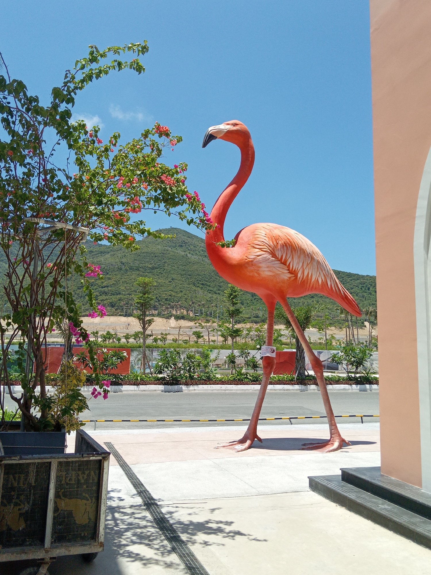 - "A large, detailed, reddish-orange flamingo statue stands upright on a light paved surface under a clear blue sky, facing left, with its head slightly turned and beak elevated" by FM-p6MFB2, licensed under CC BY 4.0