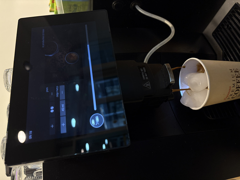 This image captures an automatic coffee machine in Ness Ziona, Israel, actively dispensing coffee