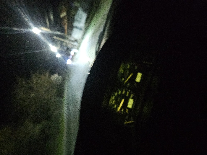 The image presents a night scene from the interior of a vehicle on a wet asphalt road in Samoranovo, Bulgaria. The illuminated dashboard gauges, displaying yellow and green light, are visible in the lower left quadrant. A speedometer and tachometer, along with two digital readouts, are discernible. The steering wheel rim is partially visible across the bottom of the frame, obscuring the lower portion of the dashboard. Through the vehicle's windshield, the road ahead is illuminated by bright artificial light sources. Several streetlights emit intense white light along the right side of the road, creating distinct lens flares. The headlights of an approaching vehicle are also visible in the distance, further down the road. The road surface appears dark and reflective, indicating wet conditions. On the left side of the road, dense, dark foliage or trees are indistinctly visible against the limited ambient light. On the right, beyond the streetlights, unidentifiable structures or buildings are vaguely present. No individuals are visible. The overall environment is dark, dominated by artificial light from streetlights and vehicle headlights reflecting off the wet surfaces.