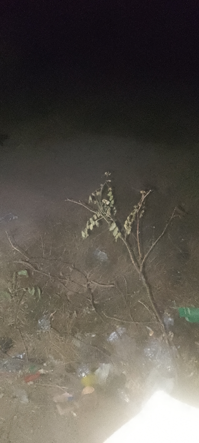 A dark, grainy image presents a sparse landscape under a night sky. A thin, bare tree with a few clusters of leaves stands amidst scattered debris and fallen branches on a dirt surface. The lower portion of the image is blurred by a bright light source, obscuring the details of the ground and adding to the low-visibility conditions.