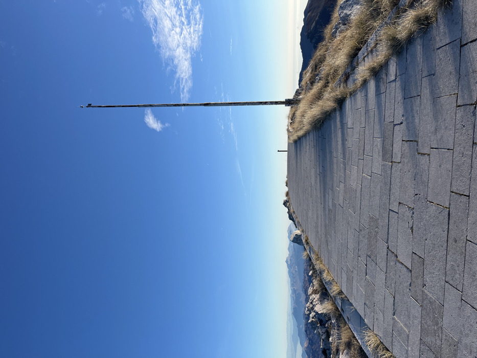 A stone-paved walkway stretches horizontally across the frame, bordered by rocky terrain and dry grass. A tall, weathered flagpole rises vertically from the walkway, reaching into a clear blue sky dotted with a few wispy clouds. Distant mountain ranges are visible below the walkway, fading into a hazy horizon. The scene captures a high-altitude view on a sunny day.