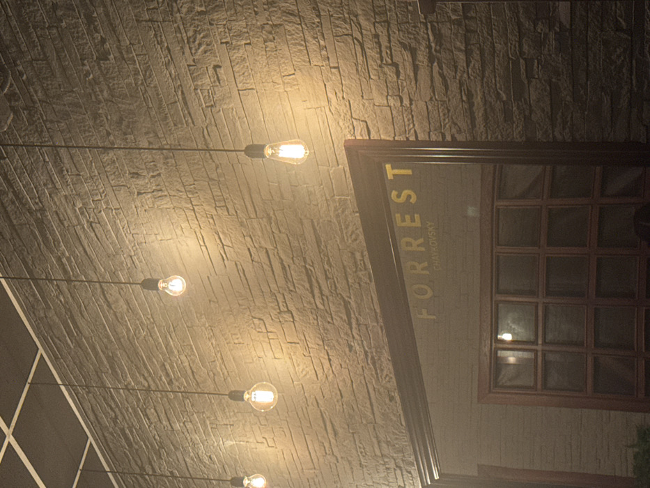 The image depicts an interior scene, likely a commercial establishment, in Chaykovsky, Russia. A textured wall clad with horizontal courses of light brown/beige stone masonry occupies the background, extending from the left to the right of the frame. Four pendant light fixtures with exposed, illuminated, warm-toned Edison-style bulbs hang from a dark, grid-patterned ceiling at varying heights. The bulbs appear to be a mix of spherical and teardrop shapes. A large, dark-framed mirror is positioned in the lower central and right portions of the image. Reflected in the mirror is a dark-framed, multi-paneled window or door structure. Directly on the mirror's surface, the word "FORREST" is prominently displayed in gold capital letters, with "CHAYKOVSKY" in smaller gold letters beneath it, indicating the establishment's name and its location within Chaykovsky, Russia. No individuals are visible.