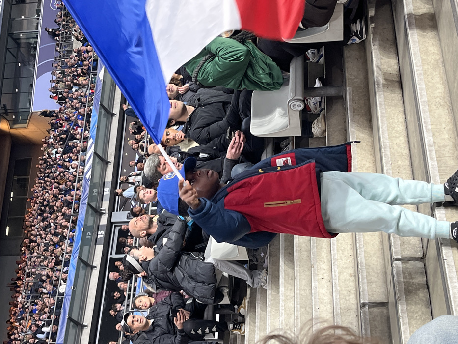 young boy wearing a red vest and a blue baseball cap holding a French flag, standing in the stands of the Stade de France in Saint-Denis, France