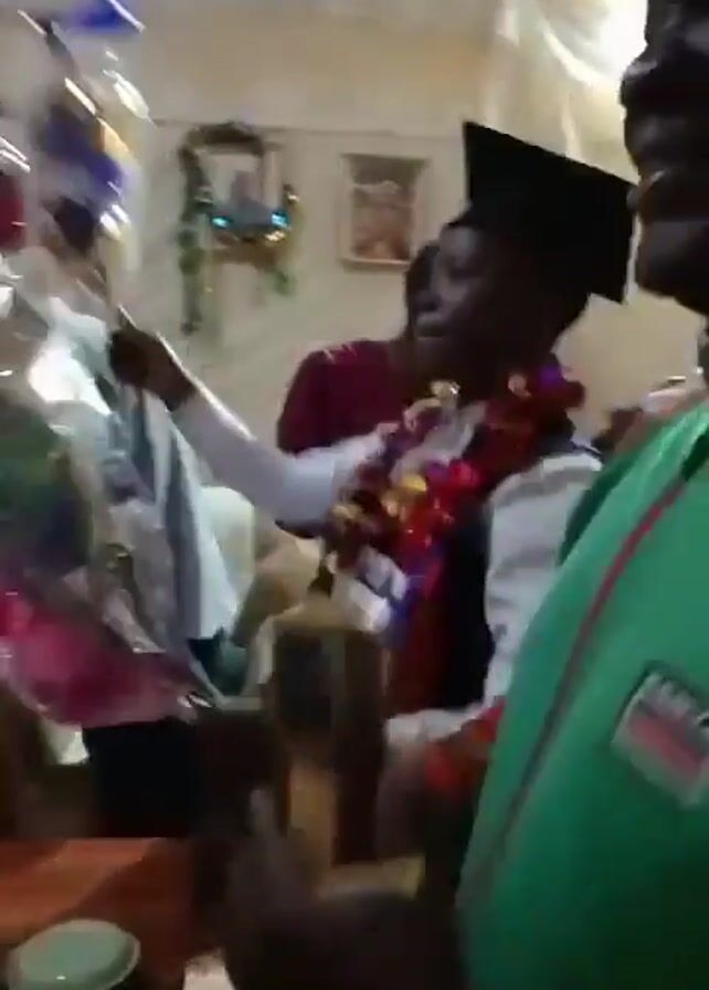 group of people in what appears to be a home setting. A young man in a graduation cap and gown dances in the center, holding decorations. Several adults are seated around a table, eating from plates. The room is decorated with pictures on the wall and appears to be set up for a celebration. There is a window in the background. The overall atmosphere seems festive.