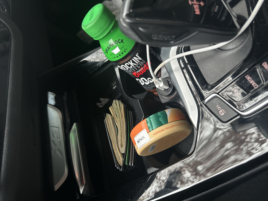 The image displays the interior of a BMW X3 vehicle, specifically the center console area, viewed from a slightly elevated perspective. In a storage compartment at the top left, a "X3" emblem is visible. Below this, a stack of U.S. currency, predominantly twenty-dollar bills, is folded and placed within a black wallet or money clip, alongside several green-colored cards. To the immediate right, a KIVA branded circular tin, featuring "TERPENE-TAILORED EFFECTS" and a green-and-orange landscape graphic, rests in a cup holder. Adjacent to it, in another cup holder, is a green-capped bottle of "SHAMROCK FARMS ROCKIN' PROTEIN CHOCOLATE 30g PROTEIN." A white USB charging cable is plugged into a black car adapter, which is inserted into a 12V power outlet positioned between the bottle and the console controls. The center console features glossy black and chrome trim, reflecting ambient light. Visible control buttons include "SPORT," "COMFORT," and a traction control "OFF" switch. A portion of a dark-colored gear selector lever is partially visible on the far right. No individuals are present in the frame. The precise location within the city of Escondido, United States, cannot be determined from the provided interior view.