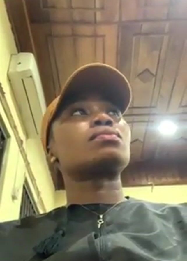 A person wearing a tan-colored baseball cap, a black shirt, and a pendant necklace is looking at the camera. The person then looks to the left. The person then looks back at the camera. The background includes a white air conditioning unit, window bars, and a wooden ceiling. Sounds of other people talking can be heard in the background.