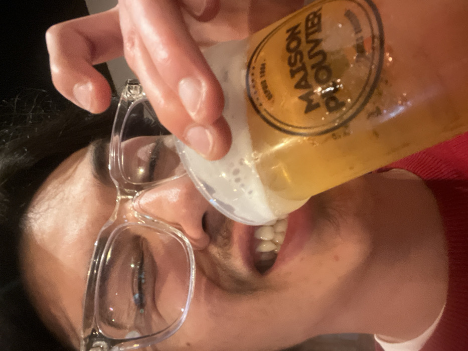 The image captures a close-up, low-angle perspective of an individual holding a clear plastic cup filled with a golden, frothy beverage, consistent with beer. The individual, appearing male, has dark hair, is wearing clear-framed eyeglasses, and exhibits a faint mustache. His eyes are squinted or closed, and his mouth is slightly open in a smile or smirk, revealing his teeth. He is dressed in a red garment, visible around his neck and shoulder. His right hand holds the cup, with fingers visible gripping the container. The cup features a prominent black circular logo with white text reading "MAISON PLOUVIER" and "DEPUIS 1894," along with smaller, less discernible text below it. Condensation is visible on the exterior of the cup. The background is dark and out of focus, indicating an indoor setting, likely a bar or similar establishment. The presence of the "MAISON PLOUVIER" branding on the cup indicates a connection to this establishment, which is located in the city of Lille, France.