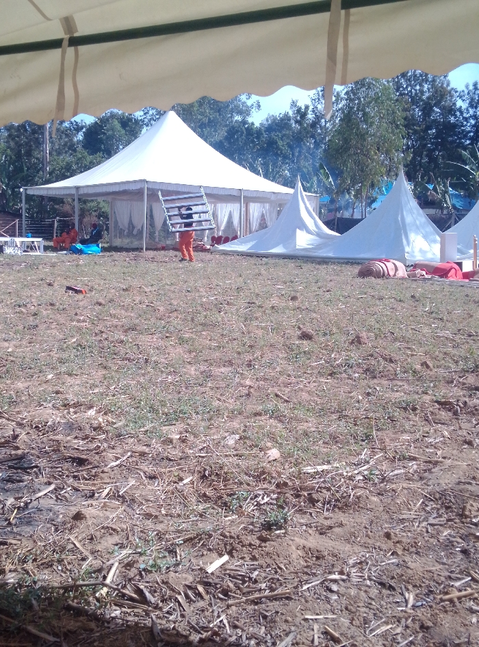 A scene outdoors shows a large white tent with curtains under a white canopy. An individual in orange carries a metal frame near the large tent. Smaller pointed tents are partially set up nearby. The ground is a mix of dirt, grass, and scattered debris. Trees are visible in the background under a blue sky. A portion of another canopy is in the foreground obscuring the view above.
