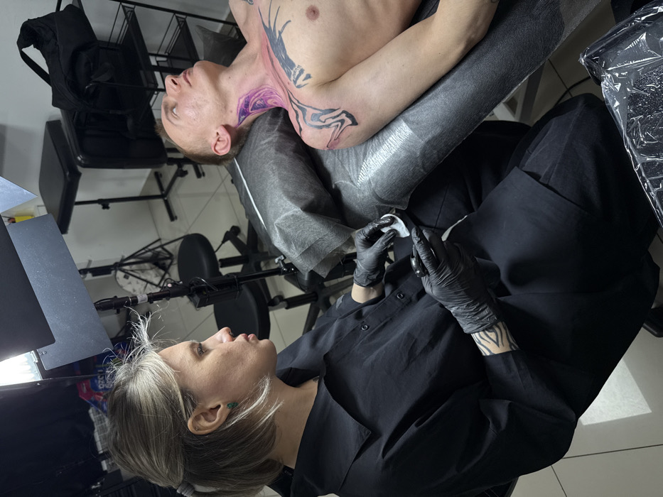 The scene depicts a professional tattoo studio in Rostov-on-Don, Russia. A fair-skinned female tattoo artist, with blonde hair partially tied back, a green stud earring in her left ear, and a black nose piercing, is seated on the left. She wears a black collared shirt, black trousers, and black nitrile gloves. A black-and-white patterned tattoo is visible on her left forearm. Her right hand operates a black tattoo machine, while her left hand holds a white tissue or cotton pad. She is focused on the client. A fair-skinned male client is positioned supine on a black tattoo bed, covered with a dark disposable sheet. His upper torso is bare. He has a large, dark, abstract tattoo on his left chest and shoulder. New, in-progress tattoos featuring swirling, abstract patterns in shades of purple, grey, and black are visible on the right side of his neck, extending to his upper right shoulder, and on his upper left arm. The client's eyes are open and directed upwards. The background elements include a large rectangular softbox light on a stand, illuminating the scene. Other equipment visible includes a black rolling stool, a dark metal multi-tiered shelving unit, and a black bag resting on the top shelf of the unit. A clear plastic-covered tray is partially visible in the bottom right foreground. The floor appears to be light-colored tile.