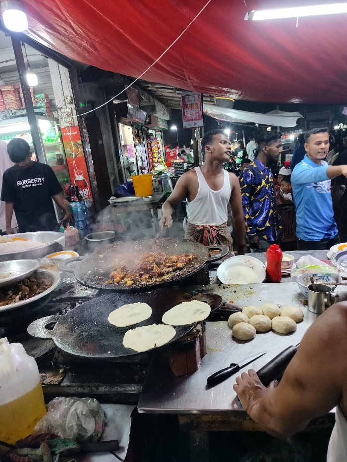 A street food stall in Charfasson Sadar, Bangladesh. A large flat top griddle is being used to cook a large amount of meat and vegetables, along with some flatbreads. A man in a white tank top is stirring the food on the griddle. There are several other men standing and watching the process, some are holding plates of food, some are interacting with the man at the griddle. An empty red plastic bottle is on the countertop, along with several plates and other dishes. The scene is lit with overhead lights and the steam from the cooking is visible. There are more shops and buildings beyond the stall, and the environment is bustling with people and activity. There are many other objects in the background, including a red plastic bottle, a blue bucket, and a green bin. There are people walking around the area, but they are not focused on. There are many other objects in the background, but they are not focused on.