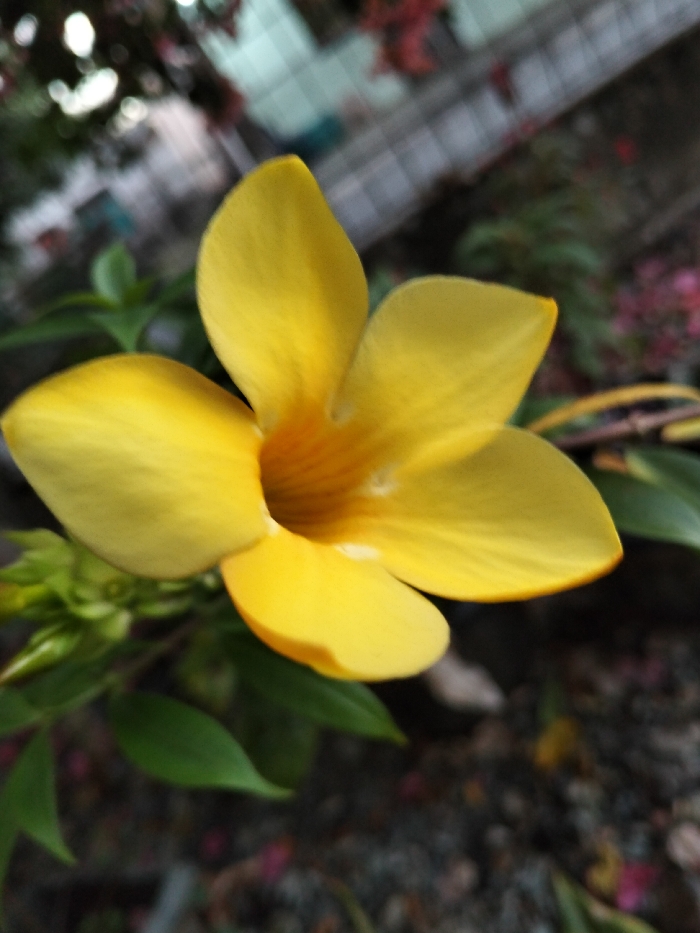 A single, vibrant yellow flower is centered in a close-up, shallow depth-of-field photograph, taken in Panton, Indonesia. The flower, exhibiting five broad, rounded petals forming a trumpet shape, features a deeper orange-yellow center with visible linear striations. Green foliage and unopened buds are partially visible and out of focus to the lower left of the flower. The background is heavily blurred; the upper-left quadrant shows indistinct light green, white, and dark forms, with a faint, out-of-focus grid pattern. The lower-right background consists of dark, granular ground cover, possibly soil or gravel, with scattered small reddish-pink specks, also out of focus. No individuals, animals, or specific man-made structures are clearly discernible.