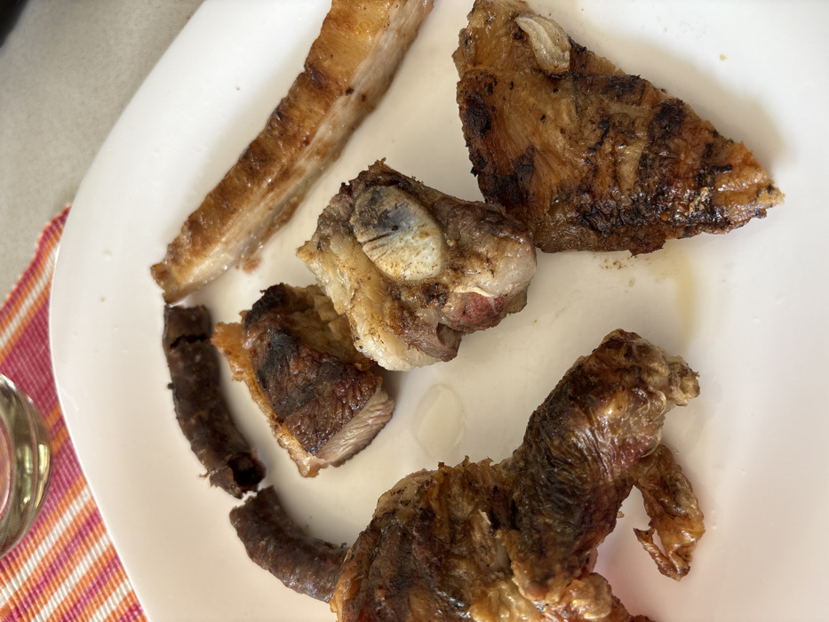 A plate displays an assortment of grilled meats. A long strip of pork belly sits alongside a triangular cut of grilled meat with dark grill marks. In the center, there's a bone-in piece of meat, possibly oxtail. Below, a small chunk of grilled meat rests next to what appears to be a broken piece of dark sausage and a larger, oddly shaped piece of meat, possibly offal. The meats have a glistening, slightly greasy appearance.