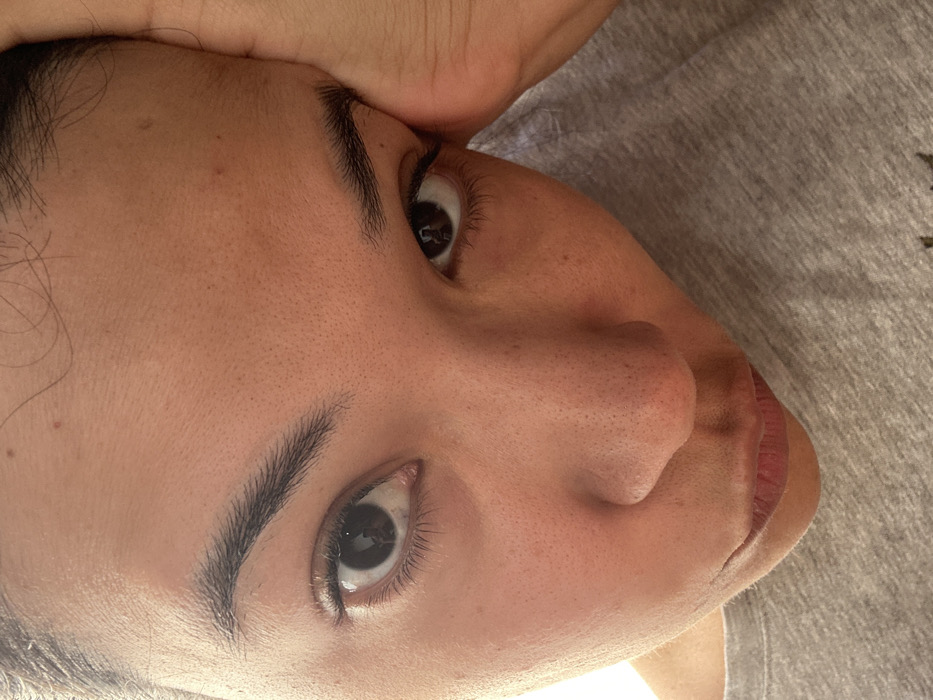 A close-up portrait shows an individual with medium skin tone, facing the camera with a slight upward angle and a head tilt to the viewer's right