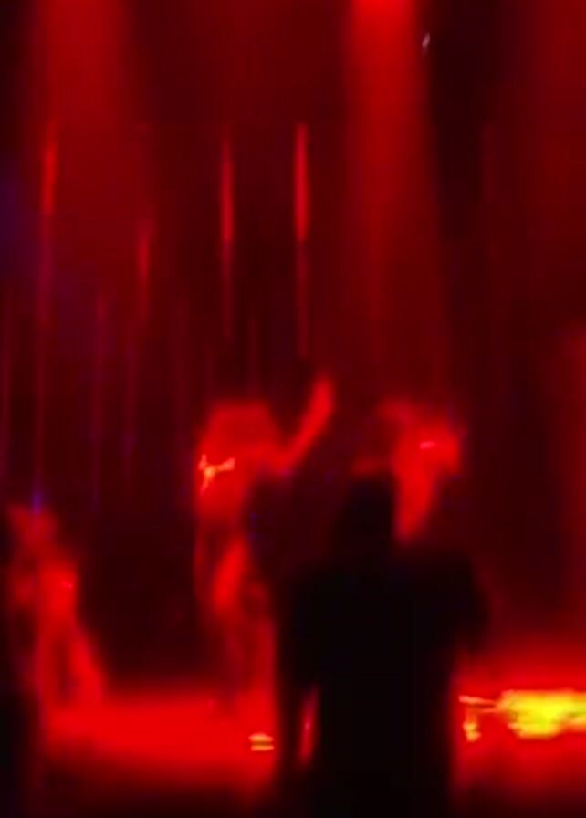 The scene depicts a concert stage bathed in red and blue light. Several silhouetted figures stand in the foreground, facing the stage, likely audience members. On the stage, blurred figures appear to be performing. The lighting is dramatic, with vertical bars of blue light punctuating the red glow, creating a dynamic and energized atmosphere.