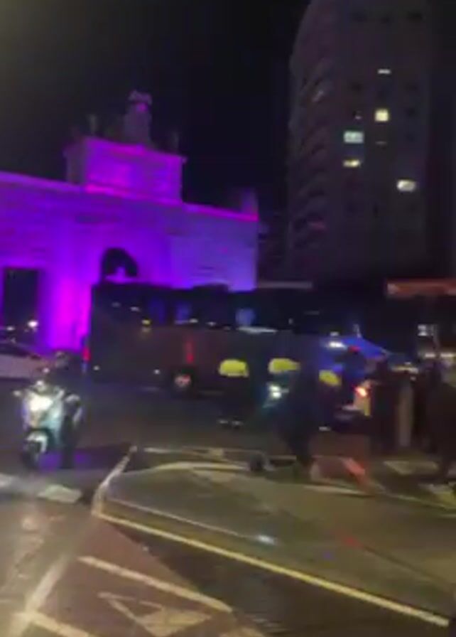 street scene at night. A large archway is lit up in purple in the background. Several people are standing around, some taking pictures. There are police vehicles present with flashing blue lights. A bus is visible behind the archway. A crosswalk is in the foreground. The camera moves around showing more of the crowd and the surrounding buildings. Some people appear to be participating in a protest, holding purple flags.