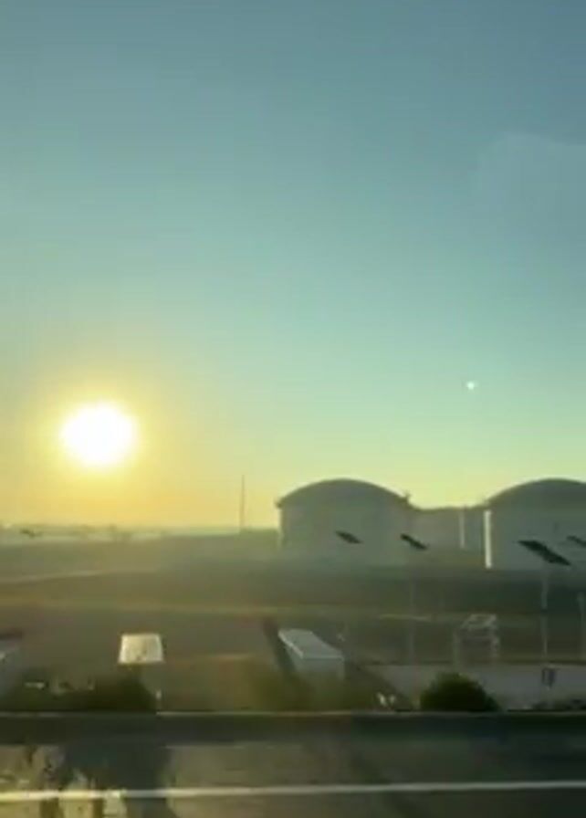 n industrial area under a clear blue sky with the sun rising on the horizon. Several large, domed storage tanks are visible in the distance, silhouetted against the bright sunlight. The ground in front of the tanks is flat and grassy, with a few small, rectangular structures placed alongside the road. The foreground shows a paved surface with painted white lines, indicating a road or parking area. The view is captured from a moving vehicle, likely a car or bus, suggested by the slight blur and motion. Music is playing in the background.