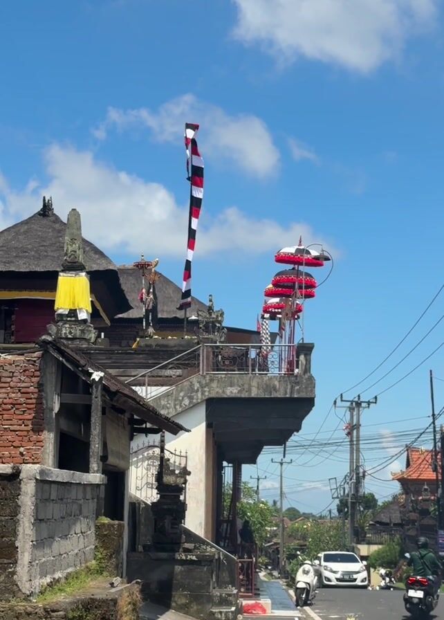 The video captures a street scene in Bali, Indonesia, featuring a traditional Balinese building decorated for a ceremony or festival