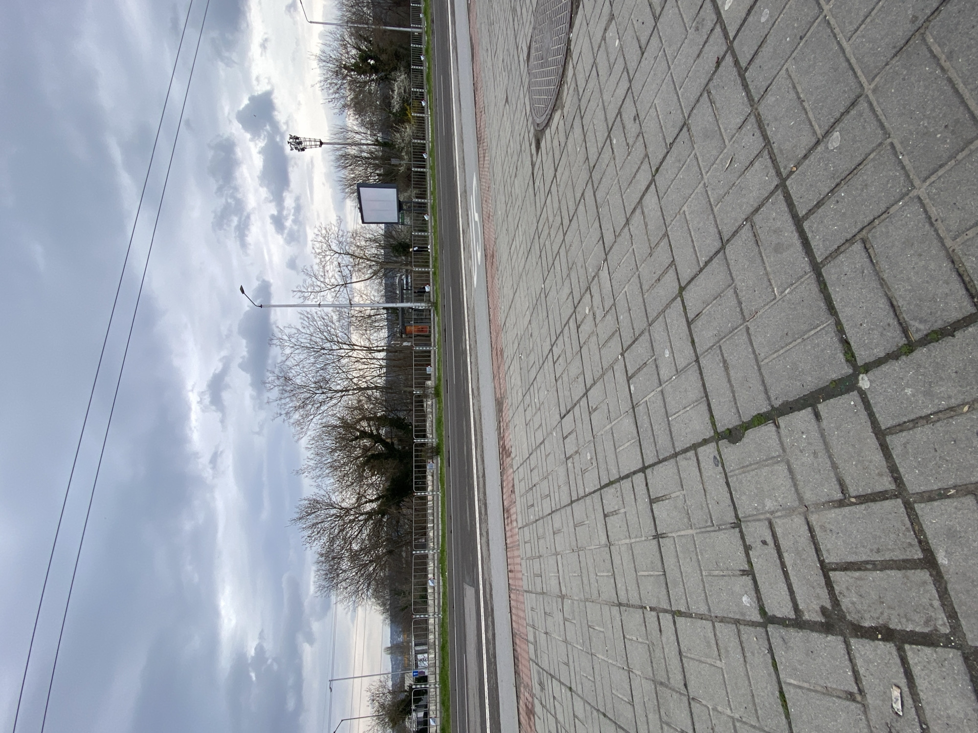 This image shows a street scene in Varna, Bulgaria. A paved sidewalk made of gray rectangular bricks dominates the foreground, with a manhole cover visible in the upper right corner. A road runs alongside the sidewalk, with a white lane marking and a painted "50" speed limit symbol. Beyond the road is a metal fence line separating the road from a row of bare trees. In the distance, there is a cityscape visible under a cloudy sky. Power lines are stretched across the sky in the upper left corner. A billboard is visible along the road.