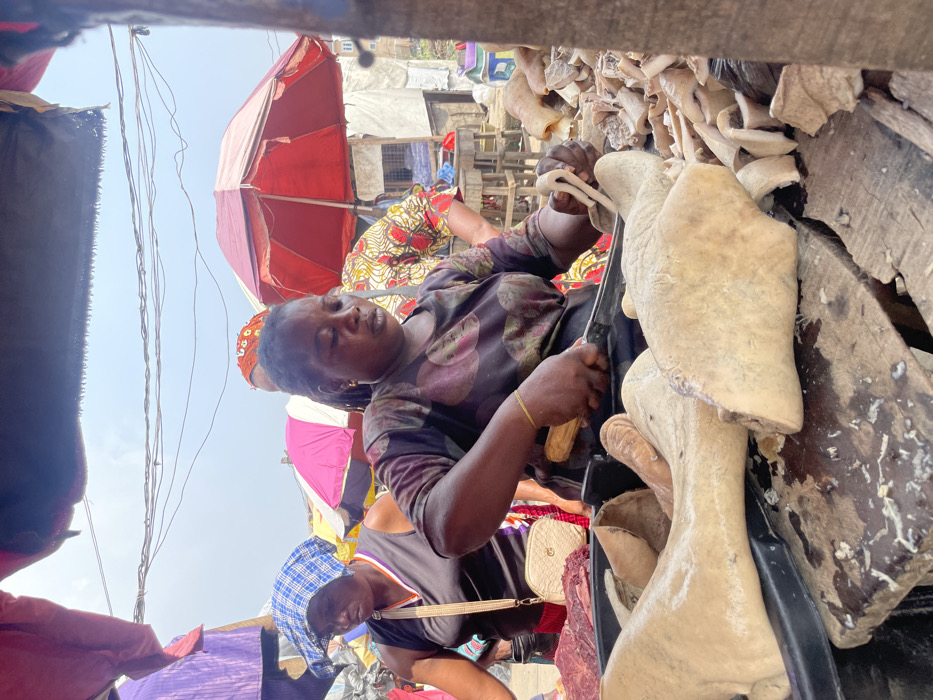 The image captures an outdoor market scene in Ebute-Metta, Nigeria, under a bright, clear daytime sky crisscrossed by utility wires. In the mid-ground, a dark-skinned woman, wearing a dark short-sleeved top with a subtle circular pattern, is actively cutting a large, light-colored piece of animal skin, consistent with cowhide (ponmo/kpomo). She holds a knife with a light wooden handle in her right hand, while her left hand steadies the skin. A thin gold-colored bracelet is visible on her left wrist. The skin pieces, some already cut into smaller strips, are arranged on a heavily stained and worn wooden cutting surface. To the immediate right of the main subject, a pile of cut skin strips is visible. A black plastic basin containing raw red meat is visible on the far left of the cutting surface. To the left of the primary subject, a second dark-skinned woman stands, wearing a dark sleeveless top and a blue and white checkered headscarf. A light-colored shoulder bag is slung across her body. She appears to be looking downwards towards her left. The background features several other individuals, largely out of focus, and multiple market stalls. Large, opened market umbrellas in red, pink, and cream/white provide shade over various sections of the market. Temporary structures made of fabric or tarps are also discernible. A dark fabric overhang partially frames the top edge of the image, suggesting the photograph was taken from within another stall or under a canopy.
