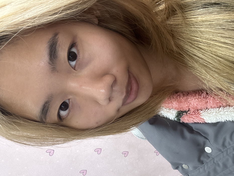 A young person with light blonde hair looks into the camera, face slightly angled. They have dark eyes, prominent eyebrows, and smooth skin. They are wearing a garment with a pink, white, and green fuzzy collar. A gray jacket is visible underneath. The background is light pink with small, scattered heart shapes. The overall image is brightly lit and appears to be a close-up selfie.