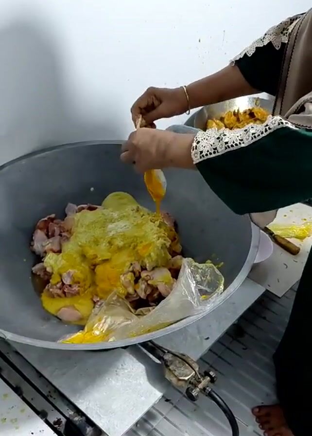 A person in a green and brown dress and hijab is adding yellow paste from a plastic bag to chicken pieces in a large metal pot. There's a gas burner underneath the pot, and another pot containing chicken pieces is nearby. The video then shows another person in a red shirt and hijab, squatting and stirring a pot on a stove in a cluttered kitchen setting. Additional supplies and containers are scattered around the room.