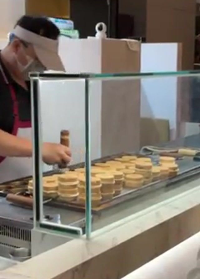 A man wearing a black shirt, red apron, and a white visor and mask is working behind a glass display case at a food stand. He's using a small wooden tool to tend to numerous round, golden-brown pastries that are stacked in neat rows on a flat, heated surface. The stand has a light-colored marble-patterned countertop. Behind the counter are various kitchen appliances and equipment, including a stainless steel sink and a security camera. The environment seems to be an indoor food court or market, with other shops visible in the background.