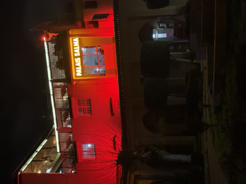 A multi-story building, "Palais Salma," is illuminated with bright red light