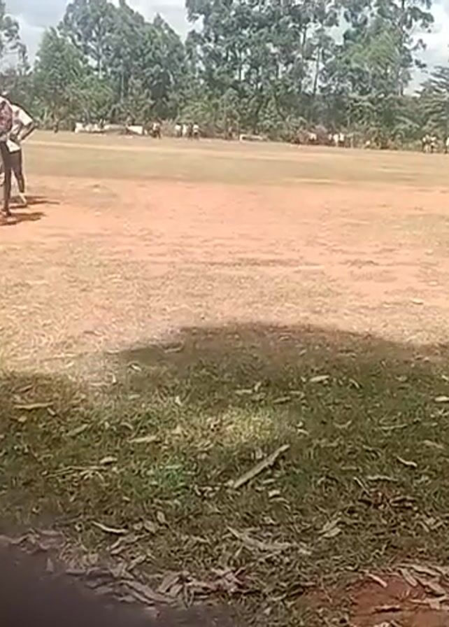 soccer field with a group of young men standing near the edge of the field, near a goal post. Some of them are wearing soccer uniforms, and others are wearing street clothes. One man has his hand raised. The field is mostly dirt, with some patches of grass. There are trees in the background. The camera is positioned in the shade, possibly under a tree.