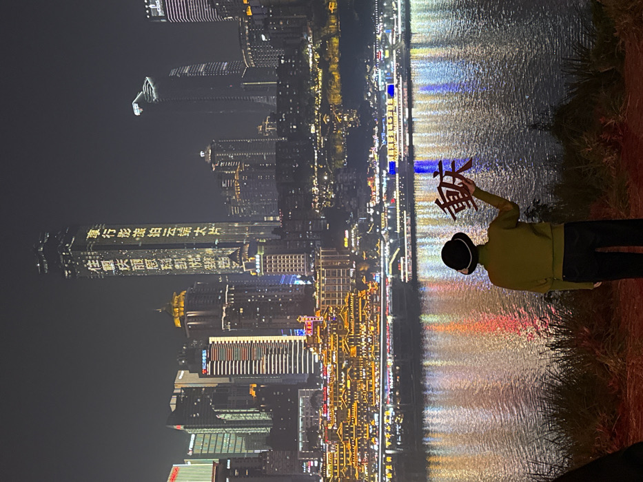 An overhead, rear-facing nighttime photograph captures an individual on a riverbank in 江北城街道, Chongqing, China, overlooking a brightly illuminated cityscape