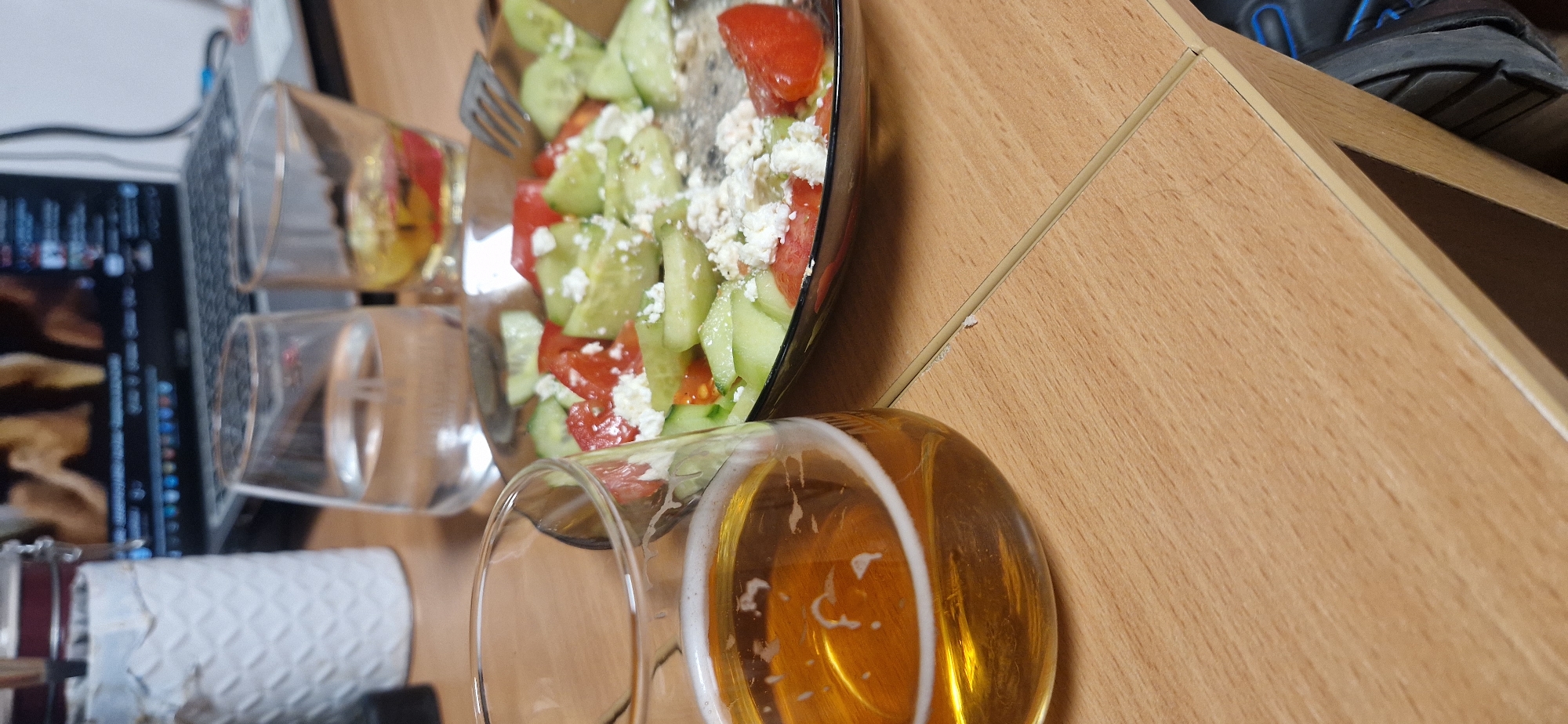 Here is a detailed description of the image: The image shows a tabletop setting, likely indoors, with a few distinct elements. There is a bowl of salad with a mix of cucumbers, tomatoes, and white cheese (possibly feta). Next to the salad are two empty glasses and one glass filled with a yellow liquid, possibly beer. A laptop is visible in the background, with a screen displaying various images. In the very far background, there is a shoe. The tabletop appears to be made of wood and there is a white patterned cylindrical object nearby. The scene is a simple, possibly casual meal setting, with an emphasis on the salad and a drink. Location details are not available.