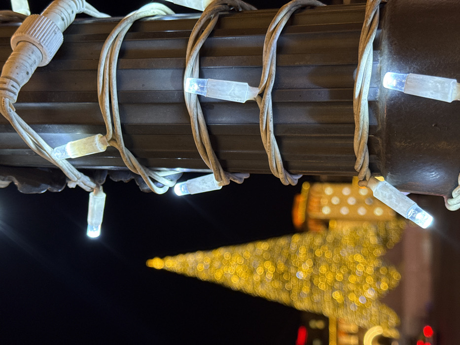 - "A close-up shot shows a dark, ribbed pole tightly wrapped with a string of white LED lights" by FM-CEkUG3, licensed under CC BY 4.0