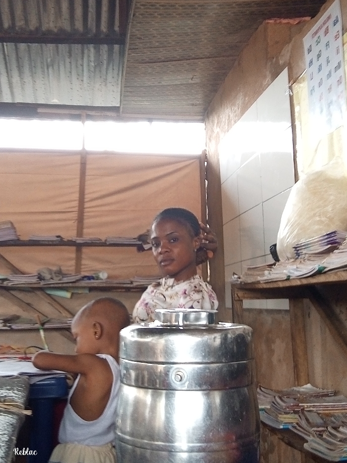 This image depicts an interior scene in a utilitarian room within the city of Unknown, Unknown. Two individuals are present: an adult female and a young child. The adult female, appearing to be in her mid-twenties to thirties, has dark skin and her dark hair is styled in braids pulled back. She wears a light-colored, short-sleeved top with a floral pattern and looks directly at the camera with a neutral expression. Her upper torso is visible behind a large, cylindrical, stainless steel container positioned in the foreground. To the left and partially obscured by the metallic container, a young child, possibly a toddler, is visible from the back and left side. The child has very short hair or is bald, wears a white tank top and light-colored bottoms, and has a small gold earring in the left ear. The child faces left and appears engaged with an unseen object or surface. The room features a corrugated metal roof, partially visible overhead, supported by wooden beams. A bright, horizontal band of window light spans the upper portion of the back wall, below which a light-tan fabric curtain or screen extends. Walls appear to be roughly finished, possibly unpainted concrete or mud brick, with a section of white ceramic tiles visible on the right wall. Unfinished wooden shelves are present on both the left and right walls, heavily stacked with numerous books, notebooks, and papers. On the upper right shelf, a translucent white plastic bag filled with a light-colored granular substance is visible, next to a laminated white wall chart with black and red text. No direct interaction is observed between the two individuals.