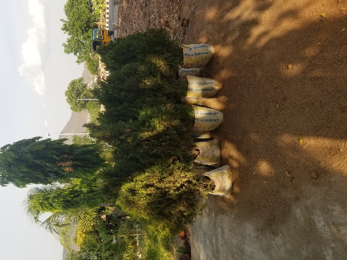 A row of seven potted conifer trees sits on a dirt path in Adonkolo, Nigeria. Each tree is planted in a white burlap sack with blue writing. The trees are casting shadows onto the dirt path. The trees are surrounded by various bushes and grasses. In the background, a yellow auto-rickshaw is driving on a paved road. In the distance, there are hills. The sky is mostly clear with a few white clouds. The ground is covered in dirt and debris.