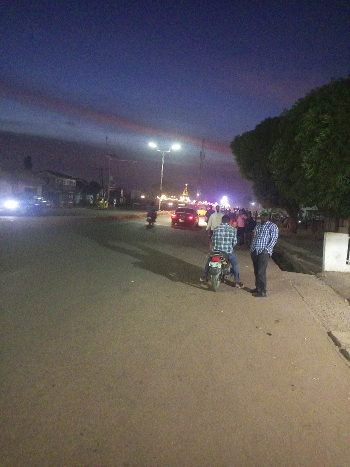 A street scene at dusk. Two men stand on the sidewalk near a parked motorcycle. In the background, a streetlight illuminates a gathering of people and vehicles. A car drives away from the crowd. A large tree stands to the right. The sky is a mix of dark blue and pink hues.
