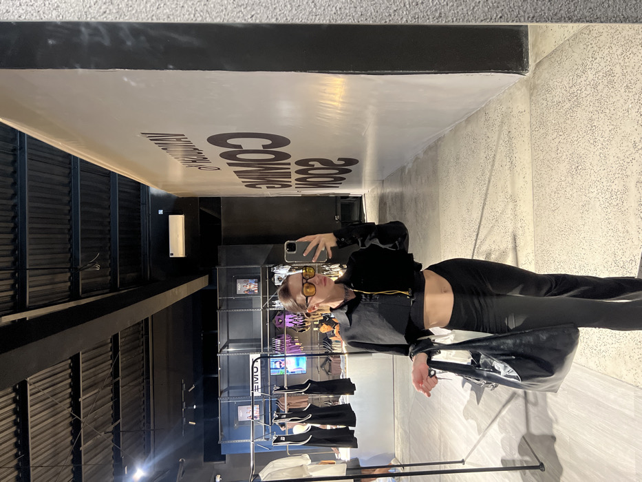 A female subject stands in what is identified as a retail establishment in Munggu, Indonesia. She is capturing a self-portrait via a mirror reflection, holding a grey smartphone in her right hand. The subject is wearing a black cropped long-sleeve shirt over a black crop top, exposing her midriff, paired with black low-rise pants. She also wears yellow-tinted aviator-style sunglasses and a small silver-colored necklace. A yellow lanyard or cord hangs from her shirt collar. Her left hand holds a large, black, possibly leather, tote bag. The background on the left shows clothing racks with white and black garments and shelving units displaying merchandise. The ceiling is dark and industrial, with exposed beams and corrugated panels. An air conditioning unit is visible on a black wall in the background. The right side of the image features a large reflective surface, likely a mirror, which displays the reverse text "COMING SOON" in large dark letters, indicating it is printed on an opposing wall. The floor is a light, speckled grey, possibly polished concrete.