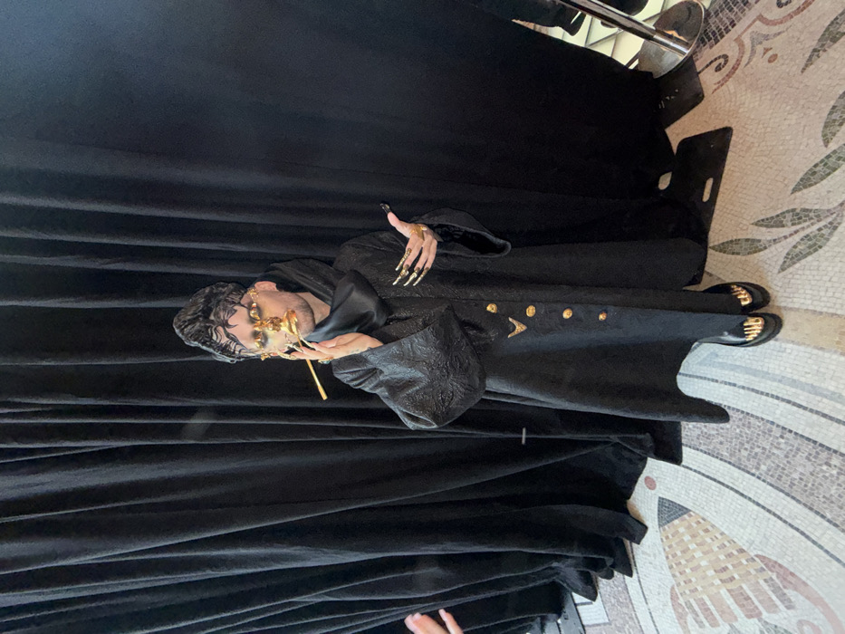 A person in elaborate avant-garde attire poses indoors in a grand interior space in Paris, France, featuring a distinctive mosaic floor pattern consistent with luxury hotels or event venues such as the InterContinental Paris Le Grand. The individual, appearing pale, wears a sculpted black headpiece, intricate golden facial jewelry framing the eyes, and a golden prosthetic covering the nose and mouth, from which a golden rod extends horizontally to the right. A black hooded cowl partially obscures the neck. The main garment is a long, textured black coat with wide sleeves, adorned with six circular gold buttons and a V-shaped gold embellishment below the collar. Both hands are accessorized with long, black, claw-like fingernail extensions and multiple gold rings; the left hand is held near the chest, while the right hand is slightly extended forward, palm upwards. Black shoes with golden, sculpted toe details are visible. The background consists of dark black curtains. A partial view of a hand from another individual is visible on the far left. A chrome stanchion base is partially visible on the floor to the right.