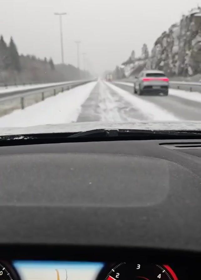 view from inside a car driving on a snowy highway. The road is mostly covered with snow and ice, with some patches of clear pavement. The car in front is a silver-colored sedan with visible taillights. The weather is overcast, with light snowfall. The highway has multiple lanes and is bordered by trees on one side and a rocky, snowy slope on the other. Street lights line the side of the road. The car's dashboard is visible, displaying the car's information. The gearshift is in "Drive".