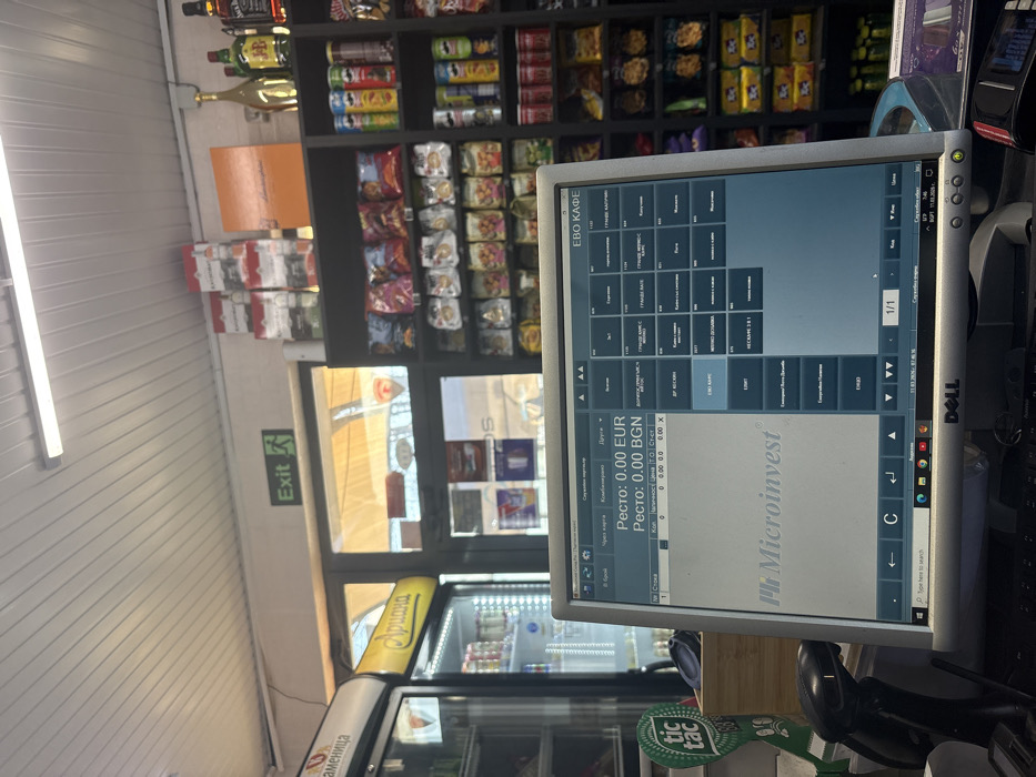 The image displays the interior of a retail establishment, identified as a convenience store or minimarket, located in Stamboliyski, Bulgaria